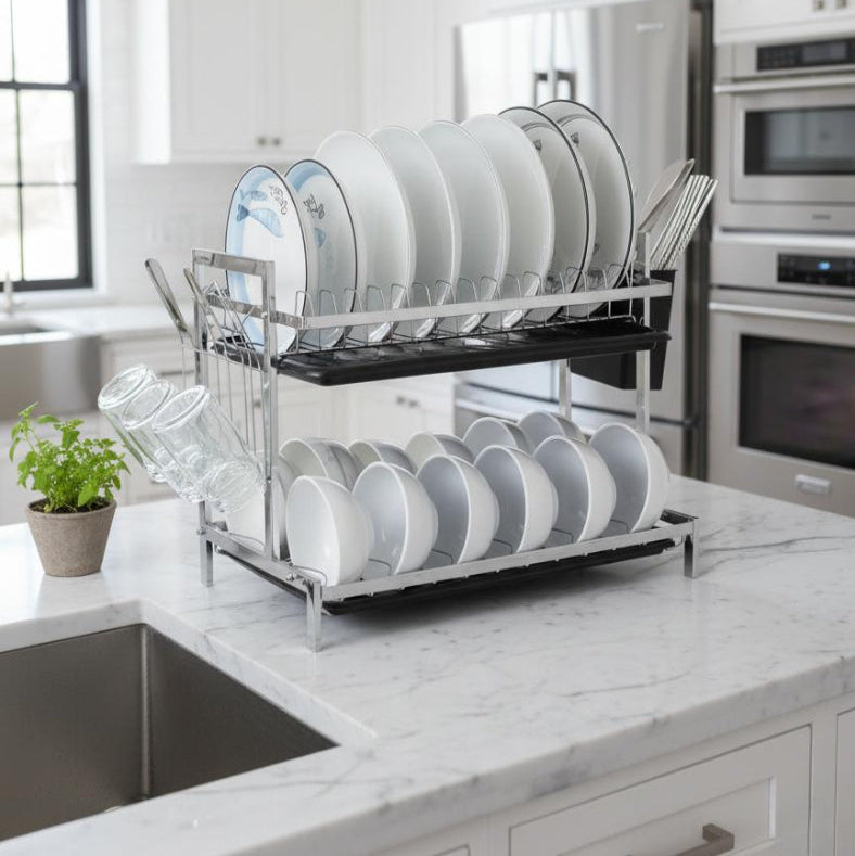 شبكة جلي معدنيه فخمة طابقين، بتاخد عدد كبير من الصحون والكاسات والمعالق. شكلها أنيق وعصري وبتنفع لأي مطبخ، حتى لو كان صغير. فيها مكان مخصص للكاسات والمعالق، وبتيجي مع صينية تحت لتجمع المي عشان ما توسّخ المجلى أو الكاونتر