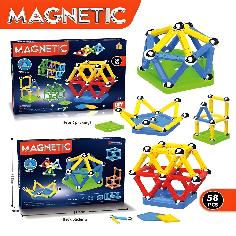 بتتكوّن من 58 قطعة مغناطيسية ملونة، بخلي الطفل يركّب أشكال وبيوت ومجسمات زي ما بدّه ✨