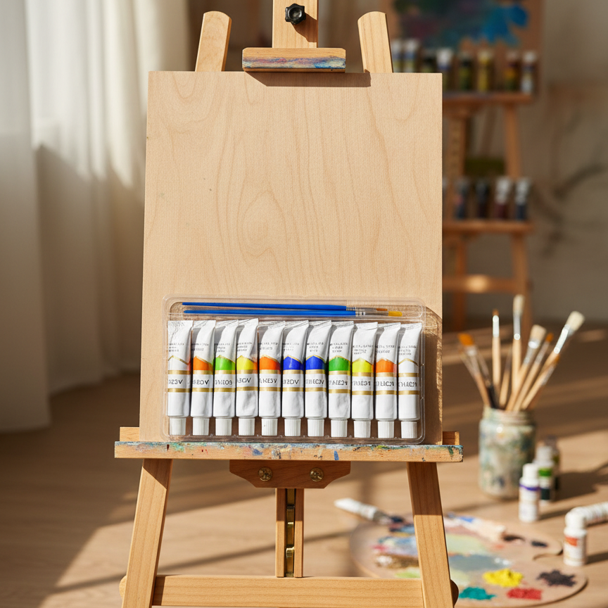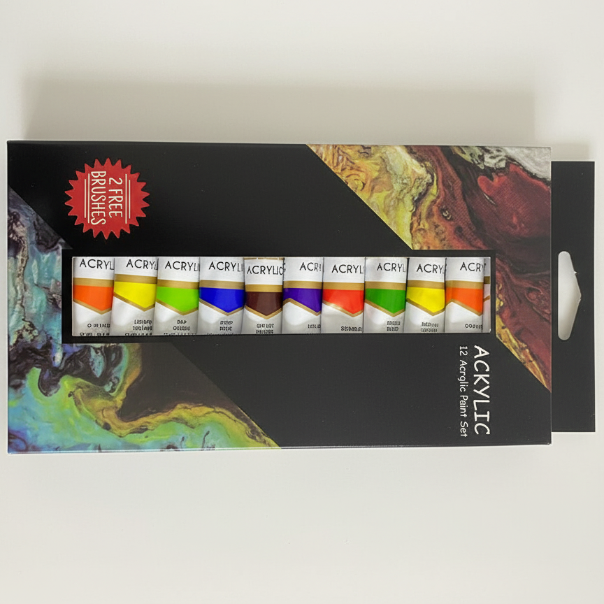مجموعة شاملة من 12 أنبوب من دهانات الأكريليك عالية الجودة، مصممة للاستخدام في الرسم الأقمشة والأسطح الأخرى، وكذلك للرسم على الجسم الألوان معروضة في علبة سوداء أنيقة، وتتضمن مجموعة متنوعة من الألوان الأساسية والمشتقة مثل الأحمر، الأزرق، الأخضر، والأصفر، والبني الداكن. العبوة تشمل فرشاتين مجانيتين مما يجعلها مثالية للفنانين والمبتدئين