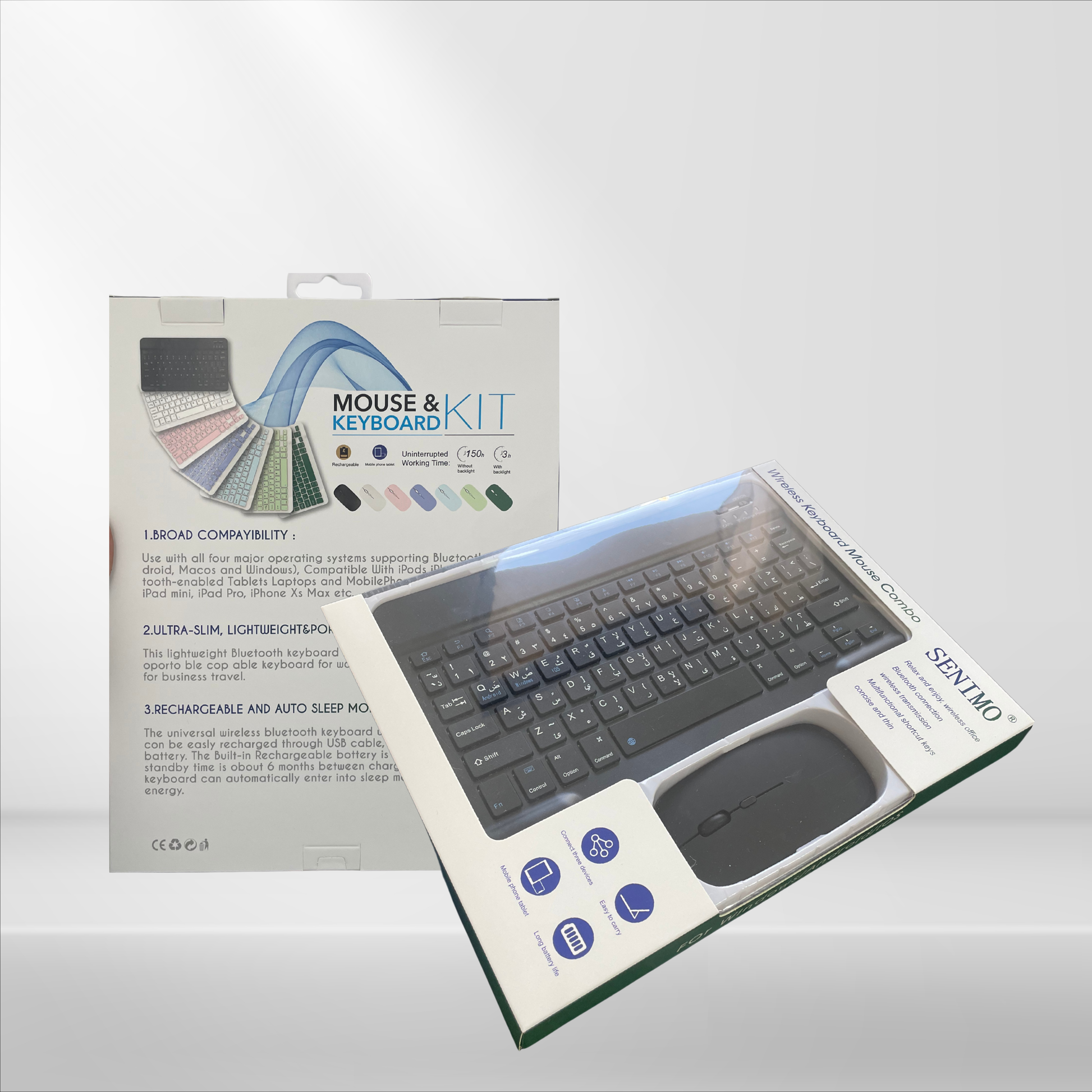 كيبورد وماوس لاسلكي أنيق من SENIMO، مخصص لراحة الاستخدام سواء للشغل أو الدراسة. بيدعم كل الأجهزة وأنظمة التشغيل (ويندوز، iOS، أندرويد)، وبيجي بتصميم نحيف وخفيف مناسب للحمل والسفر. بطارية قابلة للشحن وعمر طويل، وميزات مختصرة تسهّل عليك الاستخدام اليومي.