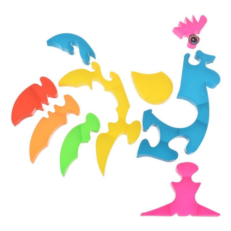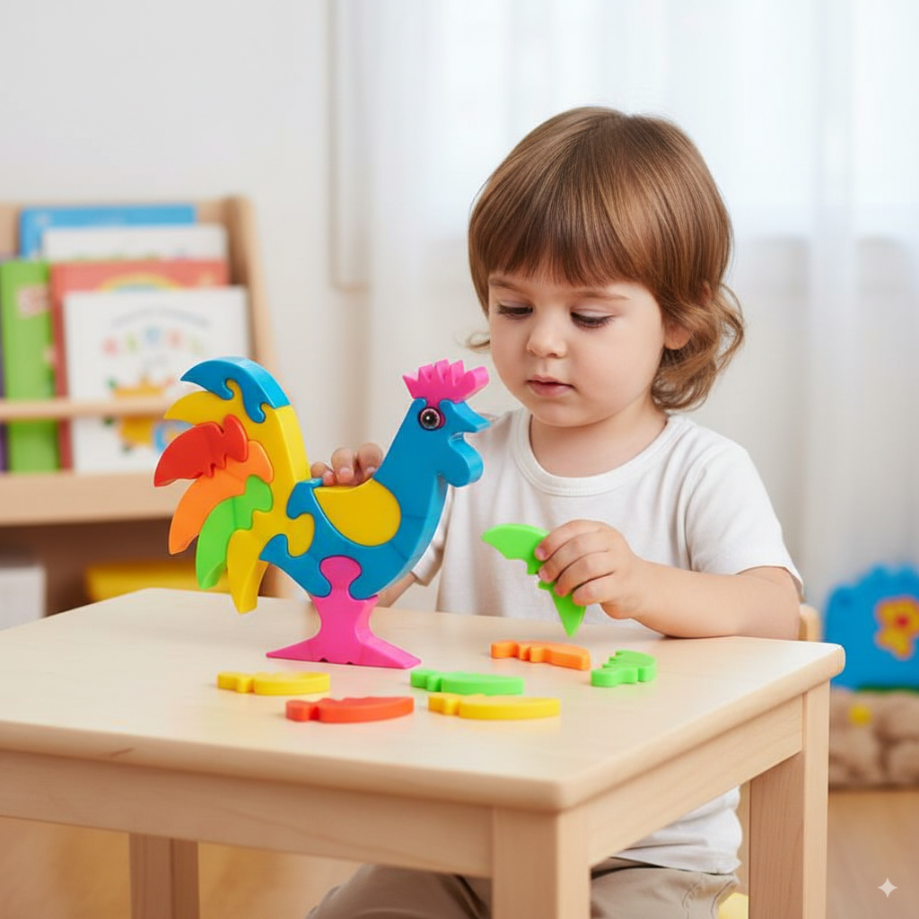 هذه اللعبة عبارة عن بازل ملون على شكل ديك، مصممة لتكون ممتعة وتعليمية للأطفال. تتكون من عدة قطع متداخلة بألوان زاهية ومختلفة