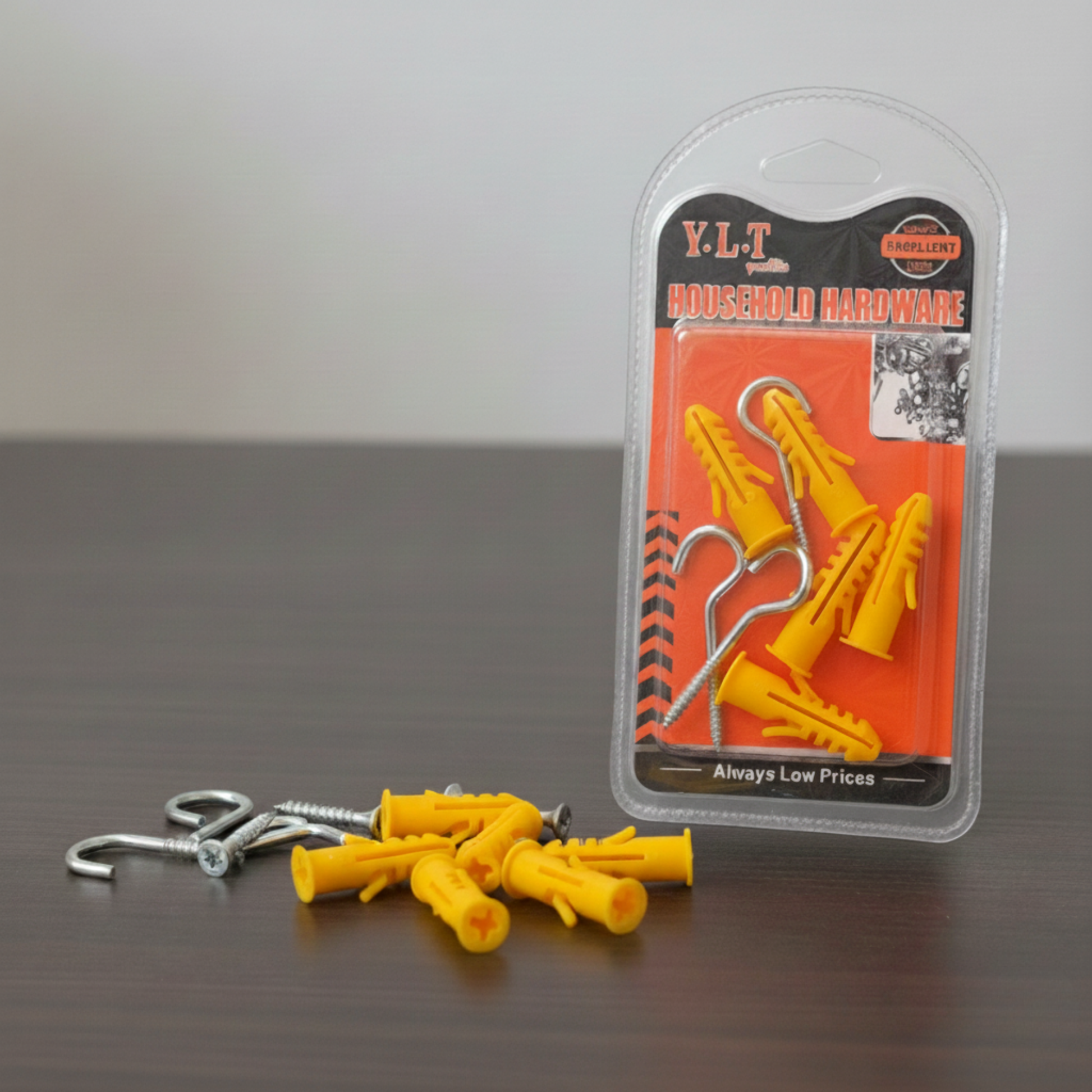 مجموعة عملية للتثبيت اليومي بالبيت، بتتكوّن من ٣ براغي معقوفة (شكل هوك) و ٤ أسافين بلاستيك قوية.