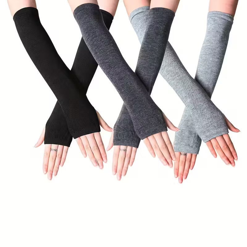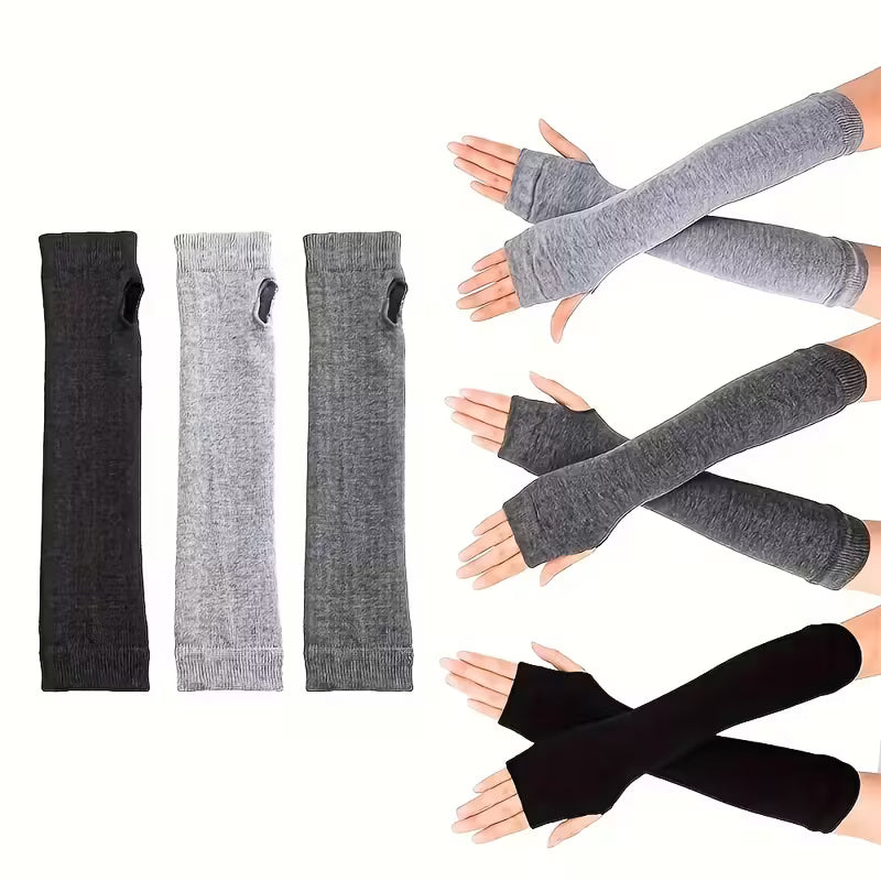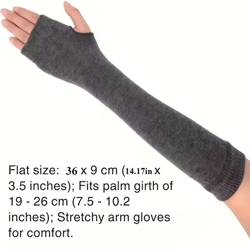 هاد الزوج من الكفّوف الطويلة رح يعطيك دفا وراحة بنفس الوقت، وبتقدري تستخدمي موبايلِك أو تكتبي بدون ما تشيليهم لأنهم بدون أصابع وفيهم فتحة للإبهام. خامتهم ناعمة ومطاطية، بتمدّ مع الإيد وبتقعد ثابتة من غير ما تعصب.