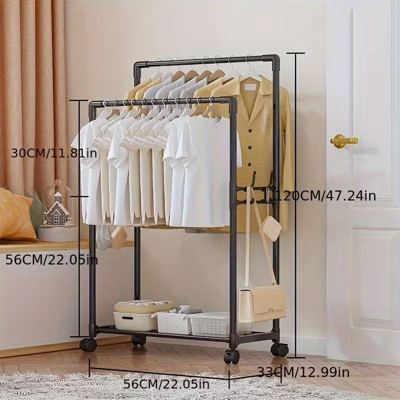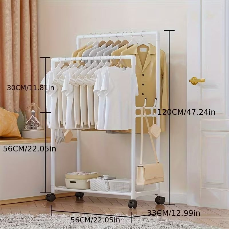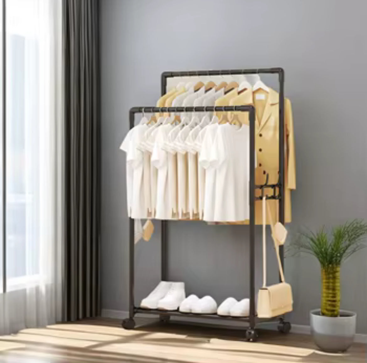 ستاند عملي لتخزين وتنظيم الملابس مصنوع بتصميم بسيط وعصري، يجمع بين شماعة لتعليق الملابس والمعاطف ورف سفلي لتخزين الأحذية، الحقائب أو الصناديق. يأتي بهيكل متين مع عجلات لسهولة النقل داخل المنزل، ومناسب لغرف النوم، المداخل أو غرف تبديل الملابس. يوفر مساحة تخزين منظمة، ويساعد على استغلال المساحة بشكل ذكي مع سهولة التركيب والاستخدام اليومي.