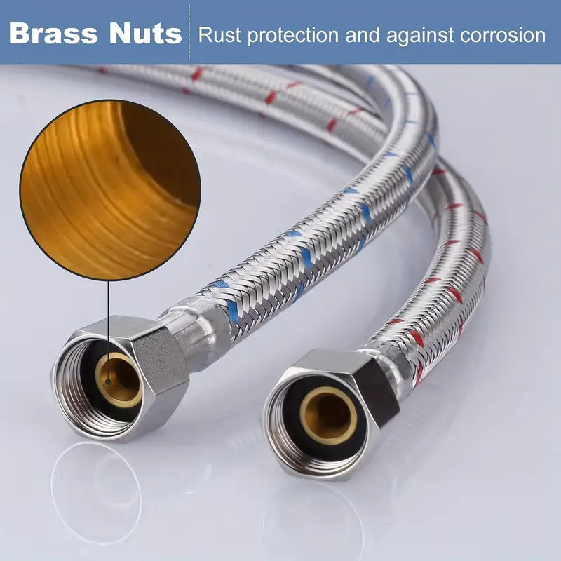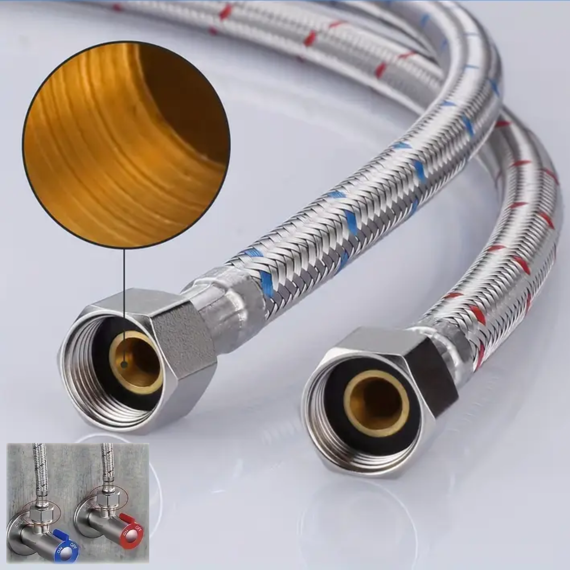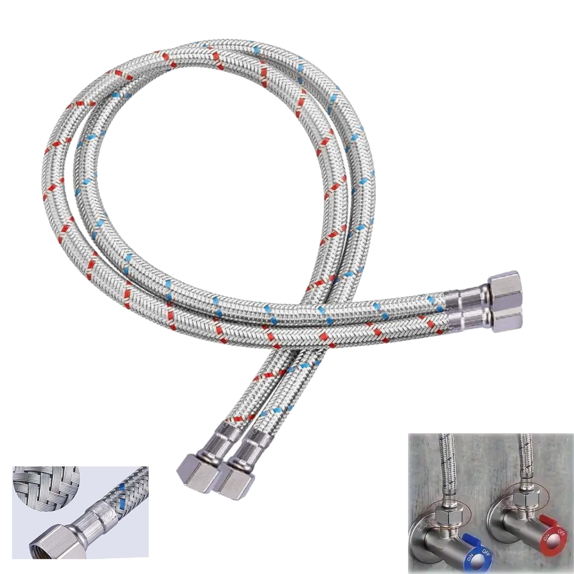 هاي ليات ستانلس ستيل مضفورة، بتركب عالحنفيات بالمطبخ أو بالحمام. في منها أحمر وأزرق عشان تفرّق بين المي السخنة والباردة. قوية وما بتسرب، وبتعطي شكل مرتب واحترافي للتوصيلات. بتتحمل الضغط العالي وبتعيش فترة طويلة بدون مشاكل.