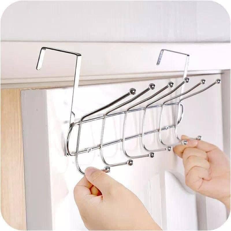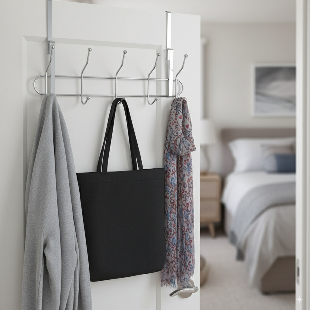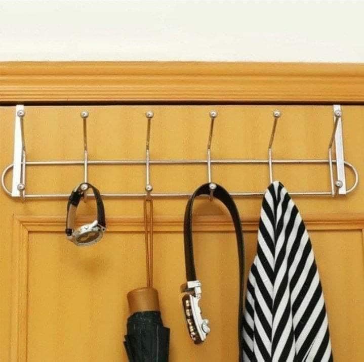 حل عملي وموفر للمساحة لتنظيم منزلك. عبارة عن علاقة معدنية مزودة بستة خطافات، مصممة لتُعلَّق بسهولة فوق أي باب داخلي دون الحاجة إلى أدوات أو ثقب الجدران. توفر هذه العلاقة مكاناً مثالياً لتعليق المعاطف، والمناشف، والحقائب، أو أي أغراض أخرى، مما يساعد على ترتيب الغرف والمساحات بشكل فعال