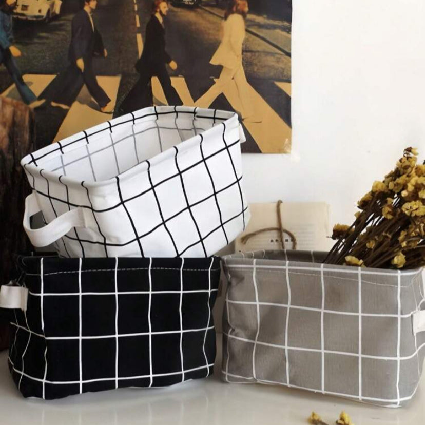 سلال تخزين أنيقة وعملية مصنوعة من القماش، مثالية لتنظيم الأغراض الصغيرة في أي غرفة. تأتي بتصميم عصري بنقشة مربعات متوفرة باللون الأبيض، الأسود، والرمادي. السلال خفيفة الوزن ومزودة بمقابض لسهولة الحمل