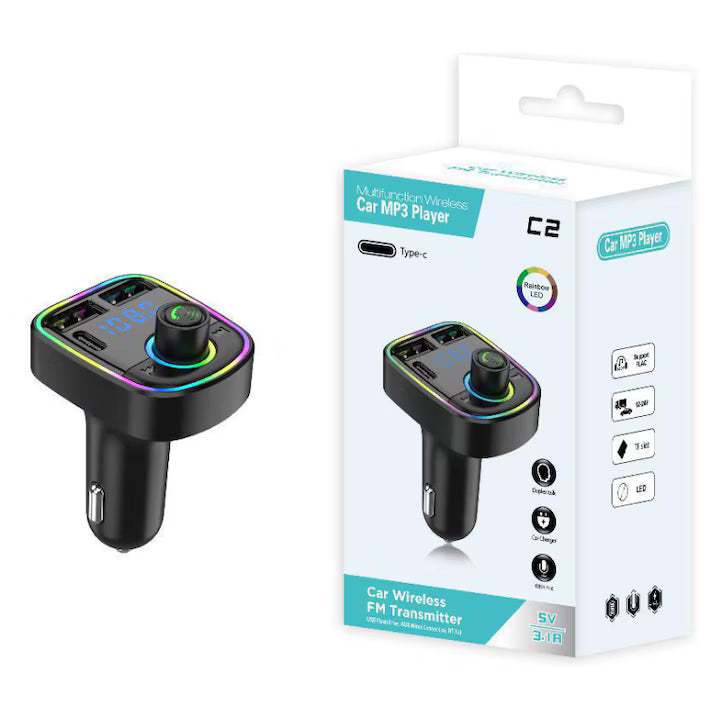 جهاز 3 في 1 للسيارة: ناقل FM لاسلكي + شاحن سريع PD Type-C + منفذين USB.