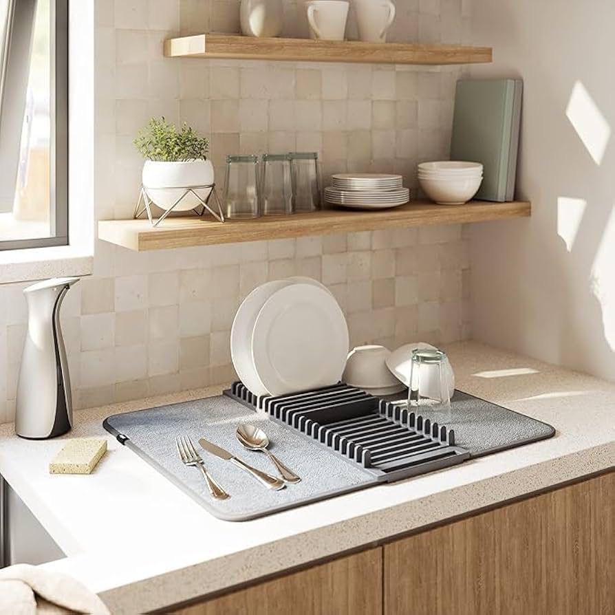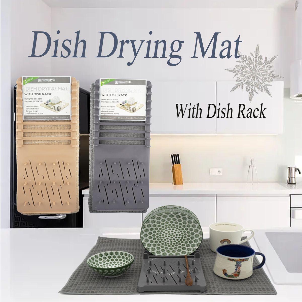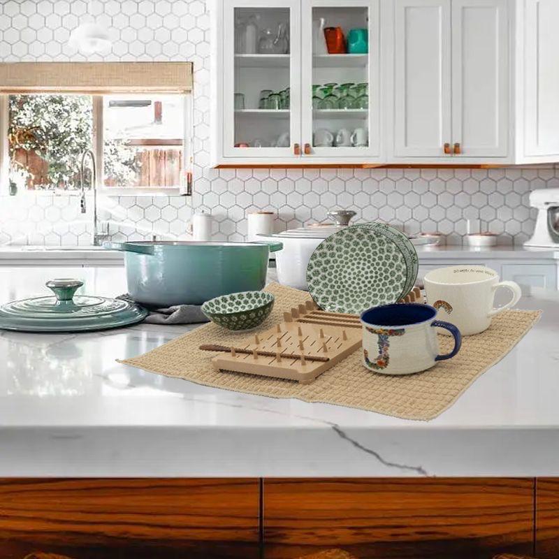 قاعدة تنشيف الصحون هذي تجي مع رف بلاستيك مرتب يثبت الصحون والكاسات بعد الغسيل. القاعدة ماصّة للمويه وتساعد على تجفيف الأواني بسرعة، والرف يرفع الصحون ويخلي المويه تنزل على القاعدة بدون ما توسّخ سطح المطبخ.