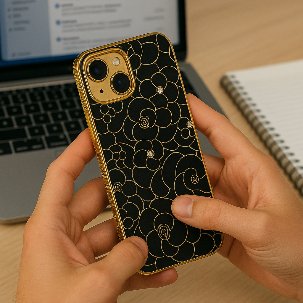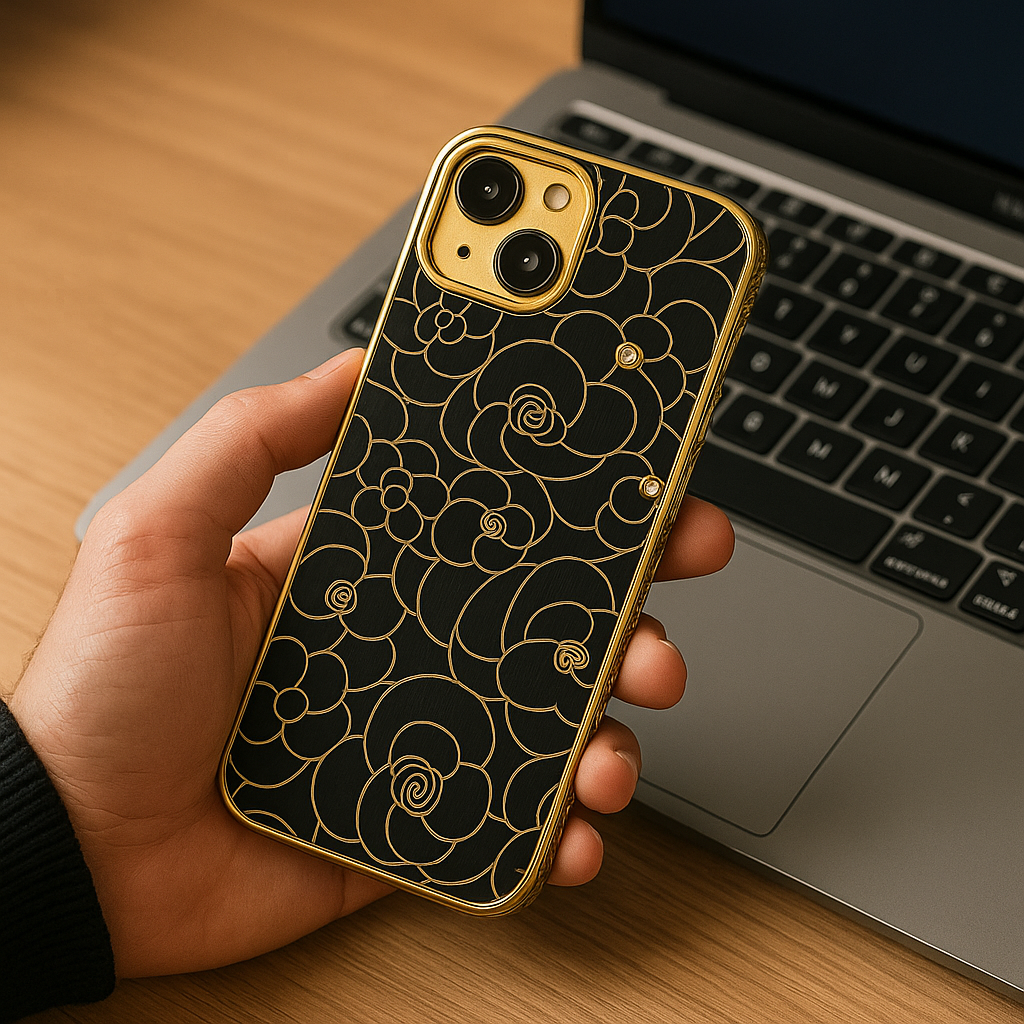 كفر ستايله مرتب وبيلمع، لونه ذهبي جليتر ومزخرف بورد ناعم، بيزبط عالآيفون 13 والآيفون 14. بحمي تلفونك وبيعطيه لمسة فخامة وأناقة بنفس الوقت. مناسب للبنات اللي بحبّوا التميز والشياكة!