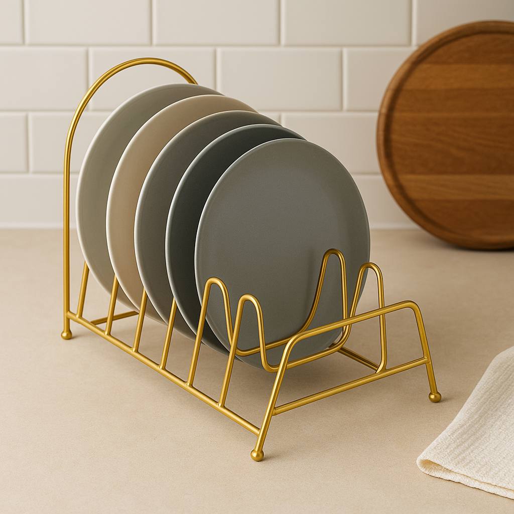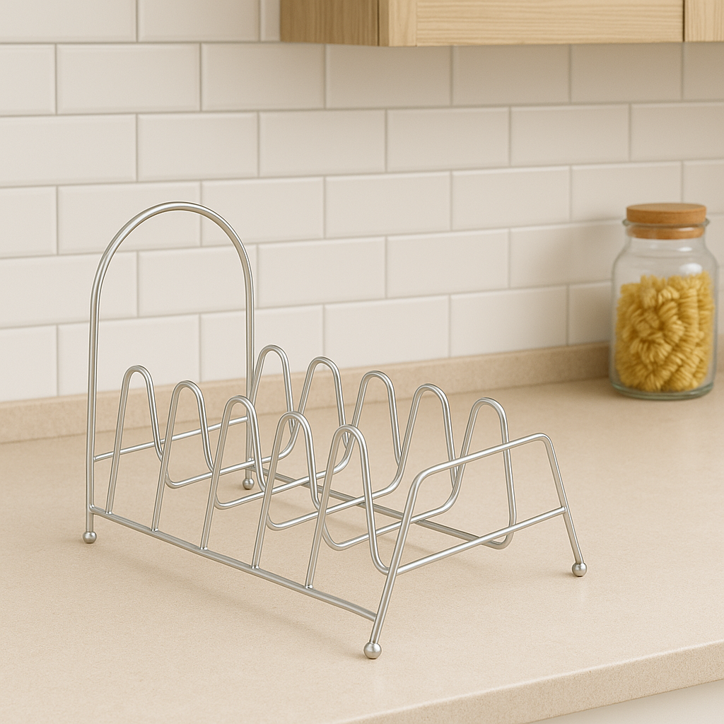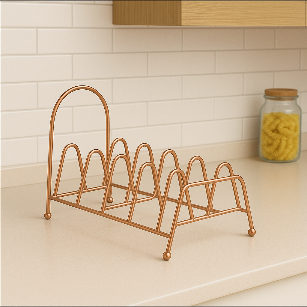 حامل عملي من المعدن المطلي باللون الذهبي، مصمم لتنظيم أغطية القدور والمقالي والصحون بطريقة مرتبة وموفرة للمساحة. يحتوي على عدة فتحات لتثبيت الأغطية بأحجام مختلفة، ويمكن وضعه داخل الخزائن أو على سطح المطبخ لسهولة الوصول والتنظيم