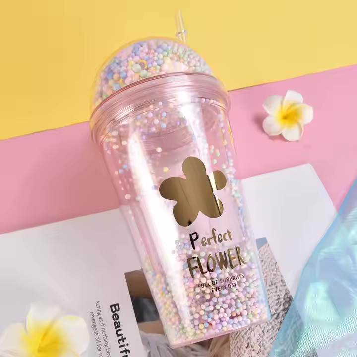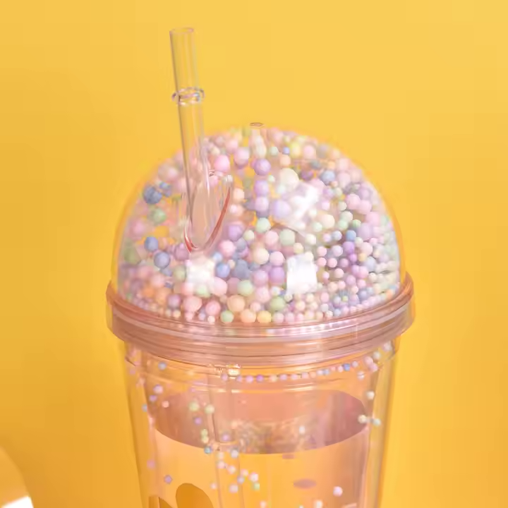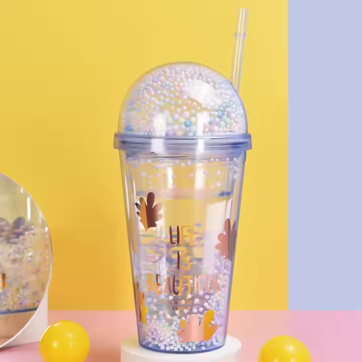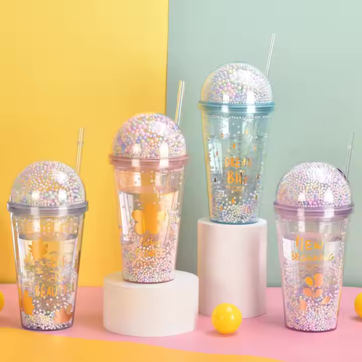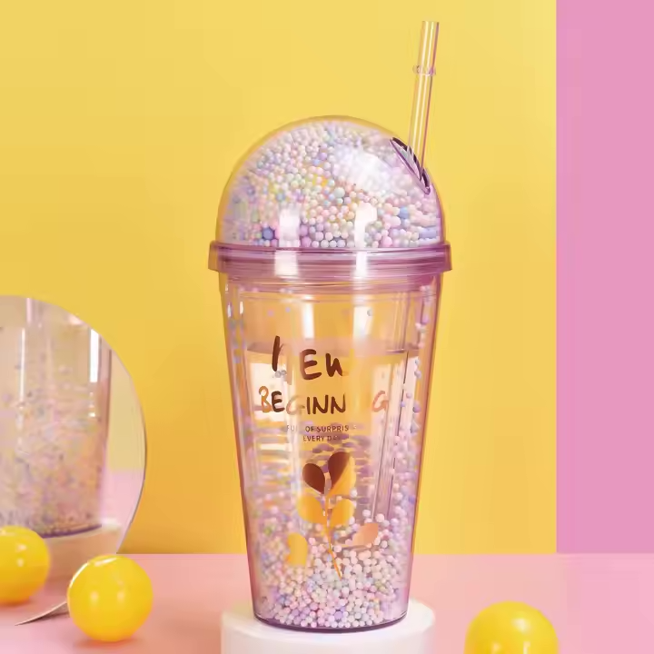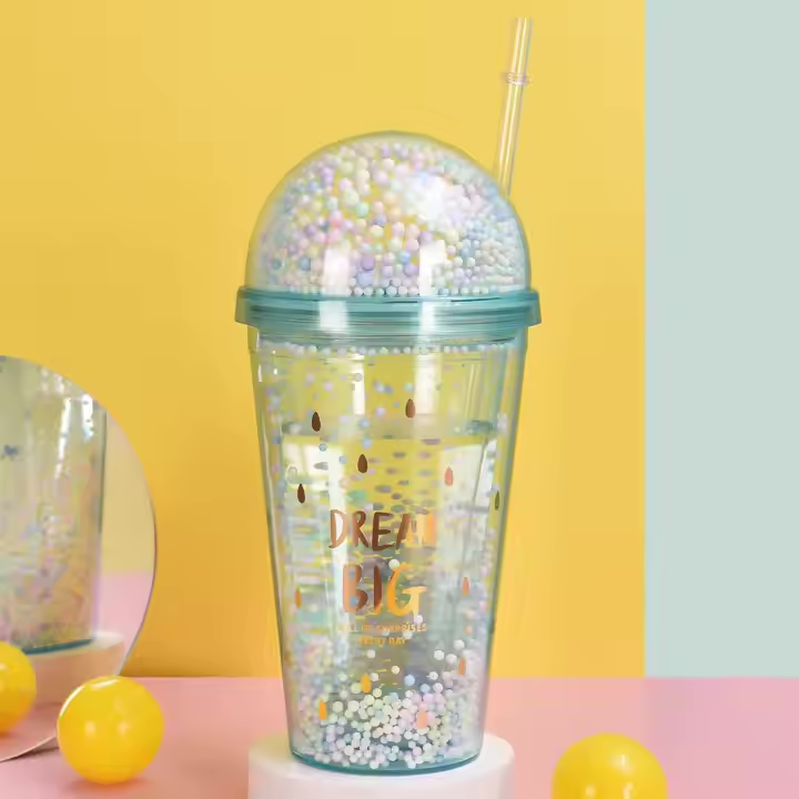 كوب بلاستيك عصري بجملة تحفيزية "Dream Big"، مليان كرات صغيرة ملوّنة تعطيه شكل ممتع ومميز، مع غطاء قبة وشلمونة (قشّة) للشرب بكل سهولة.