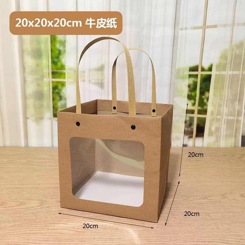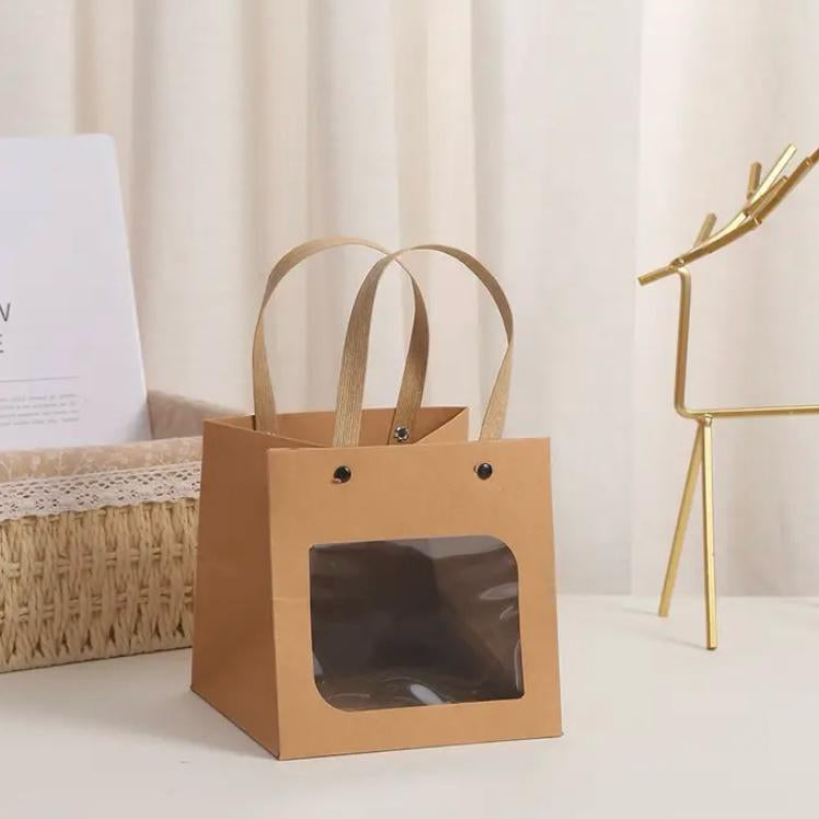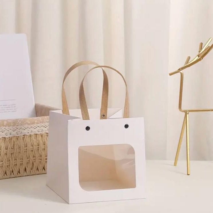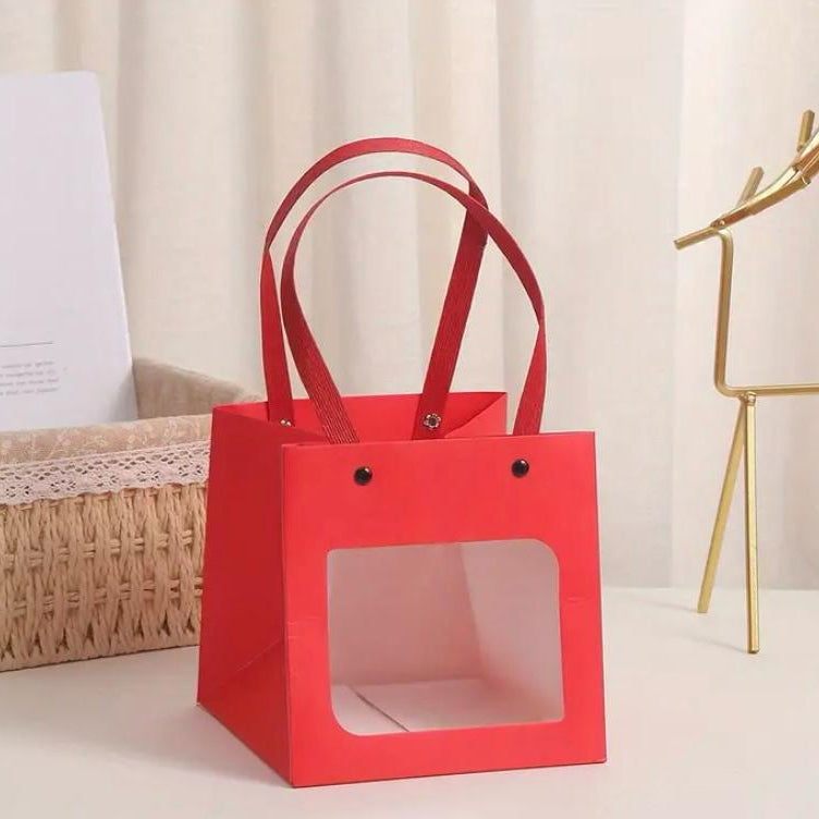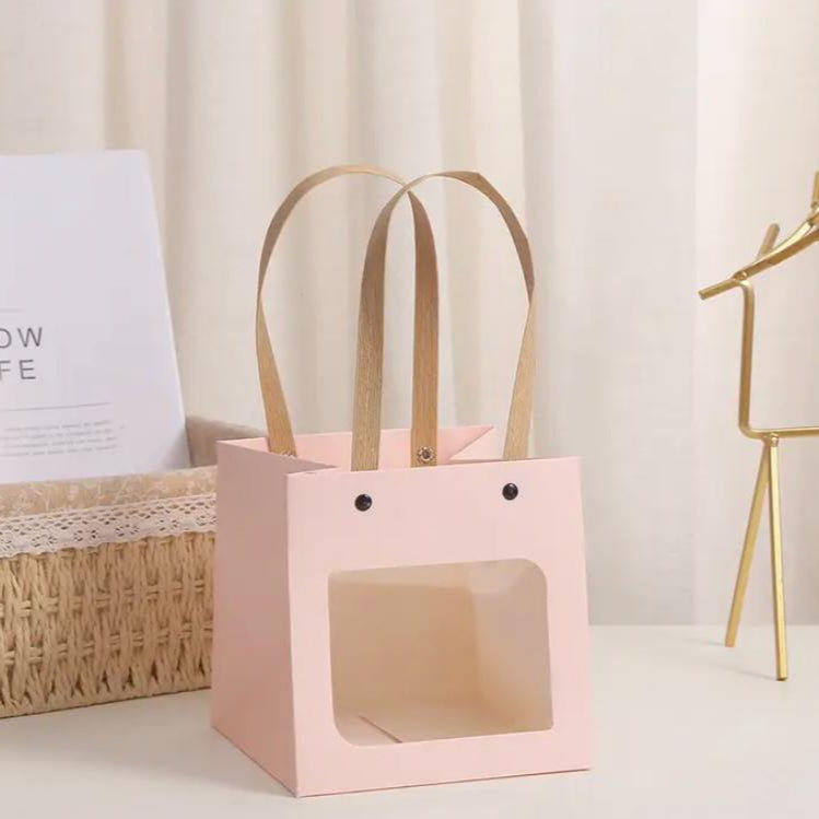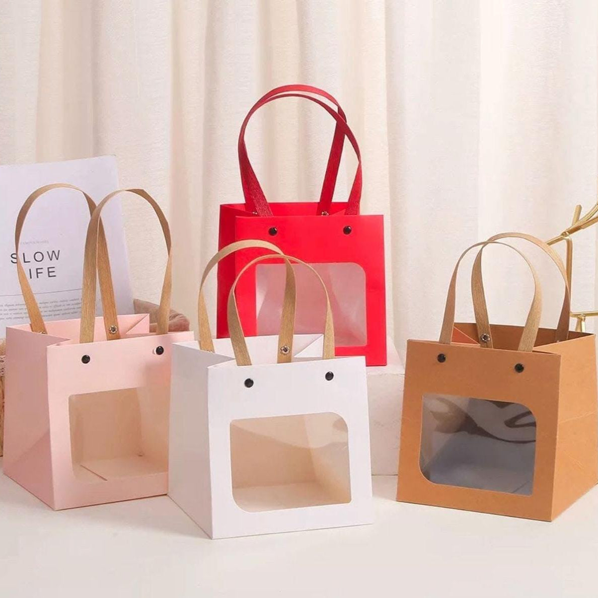 شنط صغيرة من الكرتون بألوان مختلفة وفيها جزء شفاف قدام، تستخدم للتغليف أو الهدايا. شكلها مرتب وأنيق.