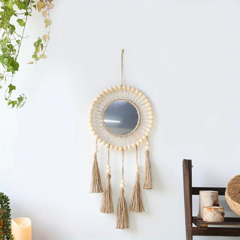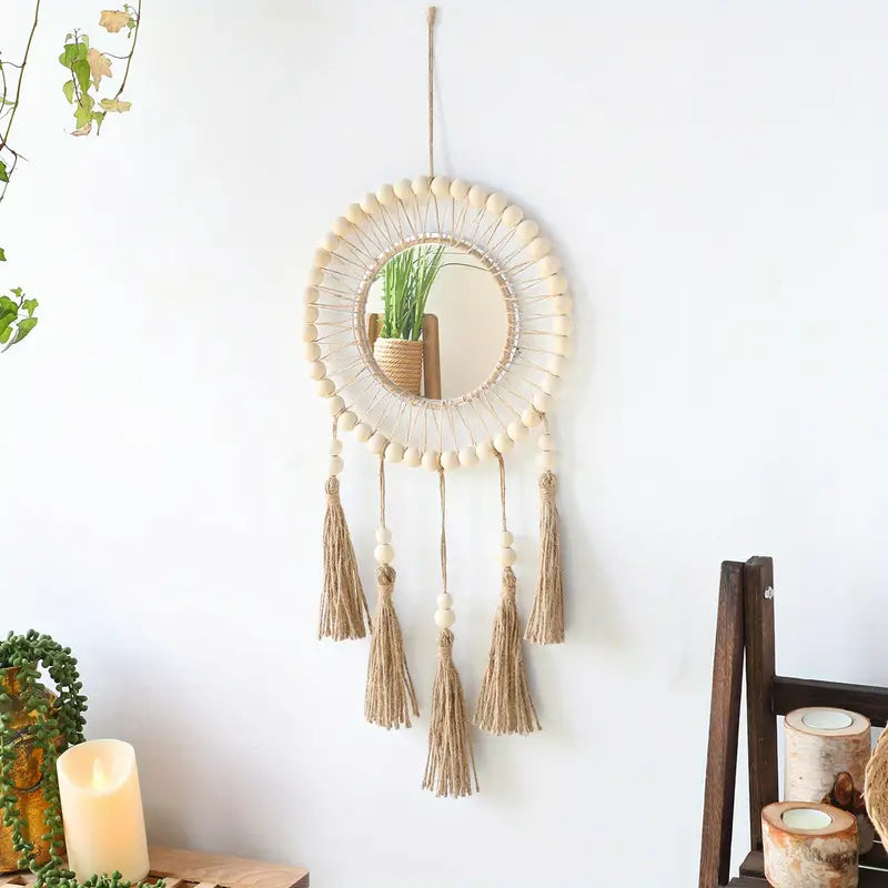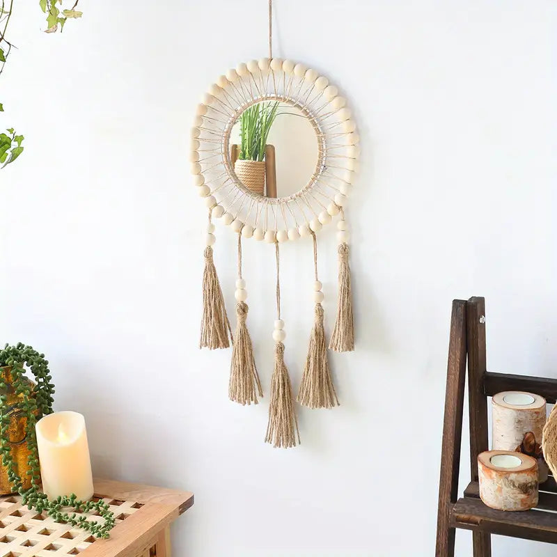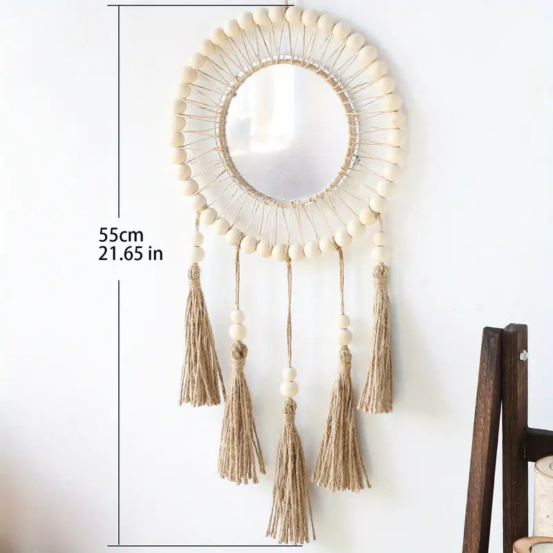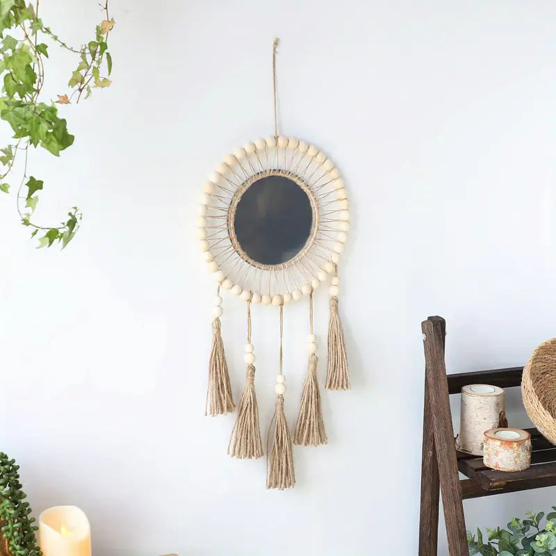هاي المراية البوهيميّة المصنوعة يدويًّا من الحبل المنسوج بتضيف لمسة دفى وأناقة على أي زاوية بالبيت – سواء كانت بالصالة، غرفة النوم، أو مدخل الباب. شكلها ناعم ورايق، وبتكمّل ديكور البيت بطريقة فنيّة وملفتة.