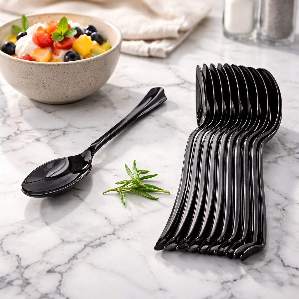 هالطقم فيه 12 ملعقة بلاستيك بلون أسود أنيق، شكلهم مرتّب وجودتهم عاليه.خفيّفين، ما بيتكسروا بسهولة، وبيعطوا لمسة مرتبة حتى على السفرة السريعة.مناسبين للطلعات، البوفيه، أو للاستخدام المَرّة الواحدة