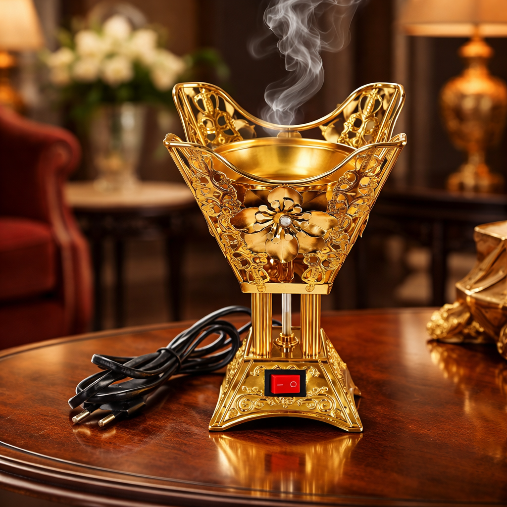 مبخرة كهربائية أنيقة بتصميم فاخر ، مزخرفة بنقوش جميلة ولمسة تراثية راقية. تعمل بالكهرباء مع زر تشغيل وإيقاف لسهولة الاستخدام، وتوفر تجربة تبخير آمنة ونظيفة بدون فحم. مثالية لتعطير المنزل، المجالس، أو المكاتب، وتناسب الأجواء الرمضانية والمناسبات الخاصة.