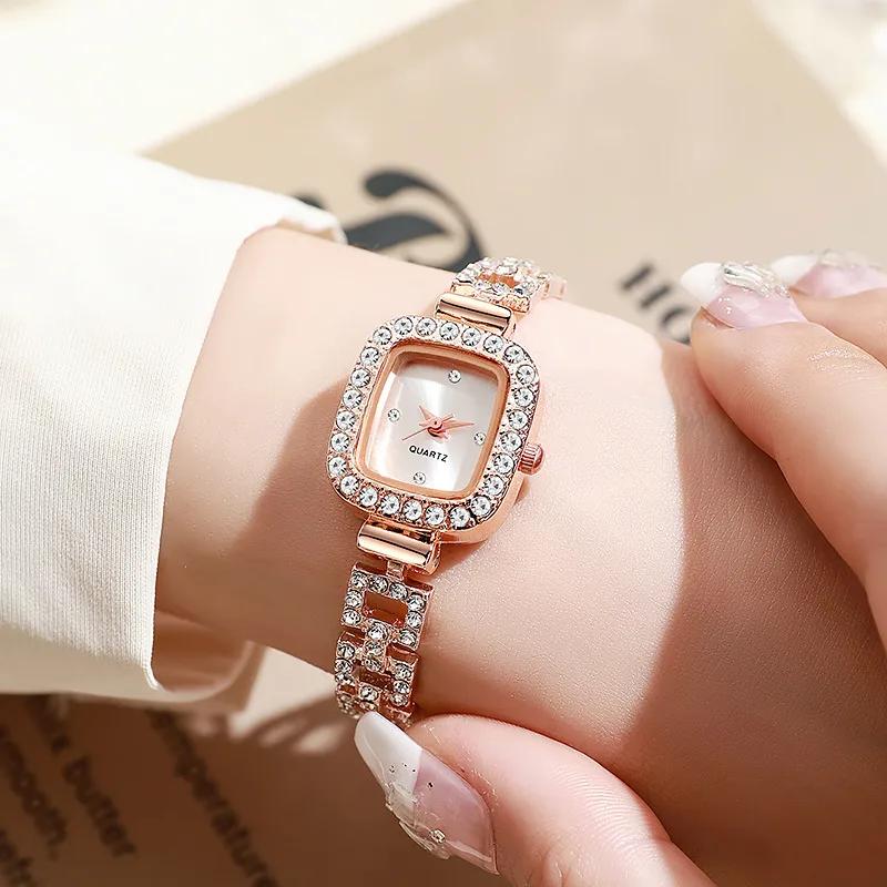 ساعة يد نسائية أنيقة بتصميم فاخر ، مزينة بفصوص كريستال لامعة حول الإطار وعلى السوار لإطلالة راقية ومميزة