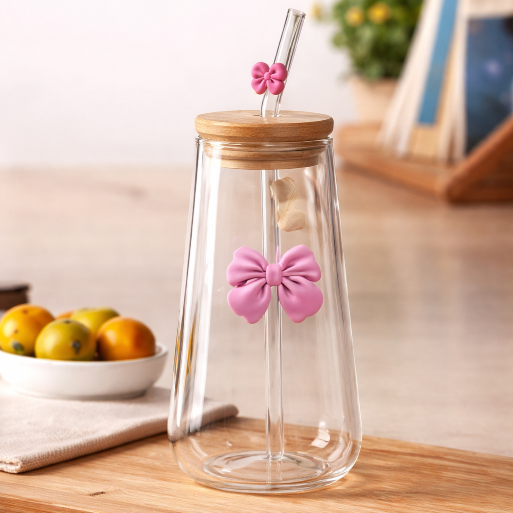 كوب زجاجي بتصميم مموج أنيق، مزين بفيونكة بلون عشوائي يضيف لمسة حيوية ومفاجأة جميلة مع كل قطعة. يأتي مع غطاء خشبي محكم وشفاطة قابلة لإعادة الاستخدام، ليكون مثالياً للعصائر، القهوة الباردة، السموذي والمشروبات اليومية.