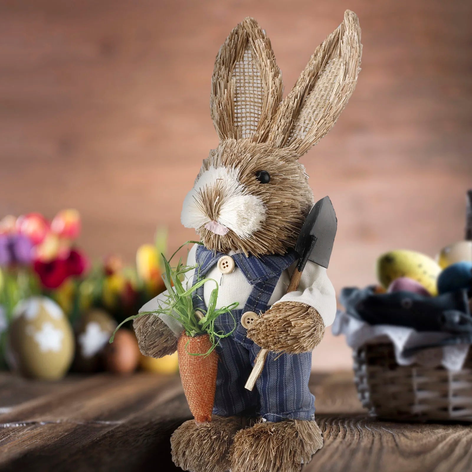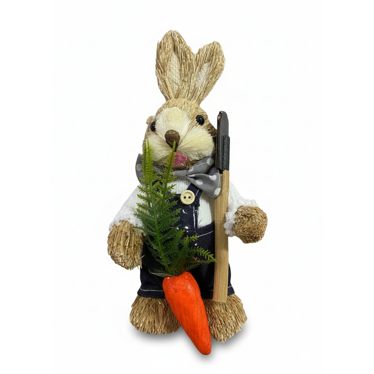 مجسم زخرفي جميل على شكل أرنب مصنوع من خامات القش الطبيعية، بتصميم لطيف وأسلوب ريفي أنيق. يرتدي الأرنب ملابس مزخرفة ويزينه رباط أنيق، ويحمل جزرة برتقالية مع نبات أخضر ولمسة خشبية تضيف طابعًا طبيعيًا دافئًا.