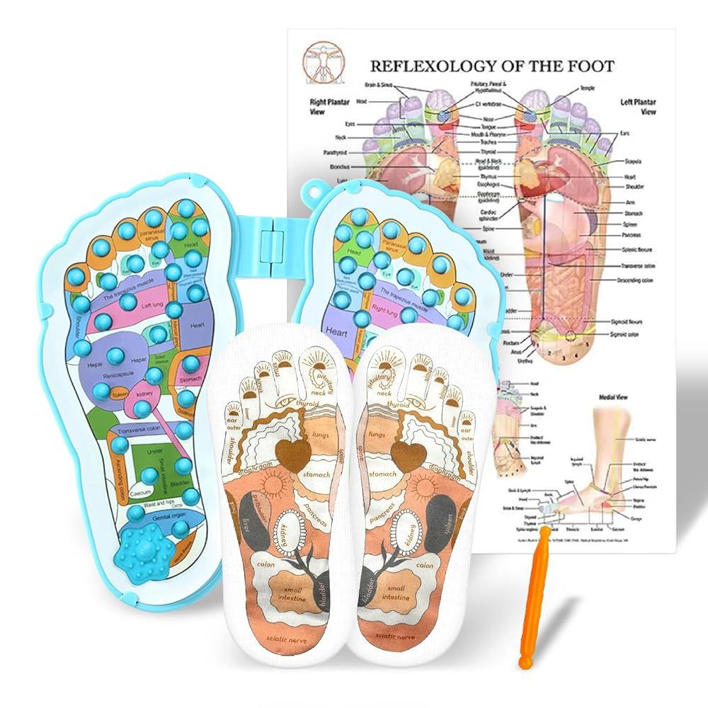 المنتج عبارة عن عدة كاملة للتدليك الانعكاسي للقدم الهدف منها تدليك نقاط معينة في القدم مرتبطة بأعضاء الجسم عشان تحسن الصحة وتريح الأعصاب